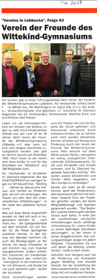 Der Verein der Freunde des Wittekind-Gymnasiums Lübbecke e.V. wurde im Dezember 1955 gegründet. Seit dieser Zeit konnten wir mit vielen tausend Euro bei Projekten helfen, die durch Mitgliedsbeiträge und Spenden gesammelt wurden.