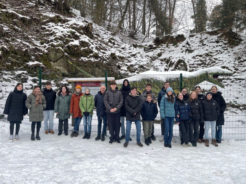 Der zweite Tag begann nach einem stärkenden Frühstück mit Einzelproben, in denen gezielt an Stimmen und Passagen gearbeitet wurde. Danach führte eine gemeinsame Wanderung zu den bekannten Saurierspuren in der Umgebung – ein spannender und willkommener Ausgleich zur Probenarbeit. Am Nachmittag folgten weitere intensive Proben in großer Runde. Dabei erhielten die Schülerinnen und Schüler tatkräftige Unterstützung von Herrn Ständike und Herrn Sewing sowie von ehemaligen Chormitgliedern aus den 80er Jahren, die extra angereist waren, um mitzuarbeiten. Zusätzlich begleiteten die beiden Mitreferendarinnen Ceyda Cankurt (Violine) und Katharina Högemann (Gesang) die Fahrt und unterstützten die Probenarbeit. Auch hier stand die Vorbereitung auf das Jubiläumskonzert im Mittelpunkt.