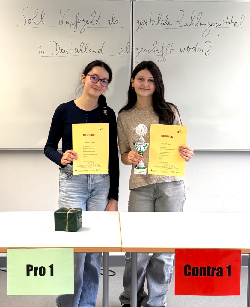 „Soll das Kupfergeld als gesetzliches Zahlungsmittel in Deutschland abgeschafft werden?“ – So lautete die Themenfrage beim kürzlich ausgetragenen Schulfinale des Wettbewerbs „Jugend debattiert“. Zwischen Kriterien wie Wirtschaftlichkeit, Nachhaltigkeit, Gerechtigkeit oder gesellschaftlicher Akzeptanz spannen die Teilnehmerinnen und Teilnehmer ein dichtes Netz aus Argumenten. Einig wurden sie sich im Austausch über die Streitfrage nicht. Im Gegensatz zur Jury, die Era Berisha (9b) nach intensiver Beratung zur Siegerin kürte. Gemeinsam mit der Zweitplatzierten Charlotte Glahs (ebenfalls 9b) wird sie unsere Schule nun beim Regionalentscheid in Detmold vertreten.