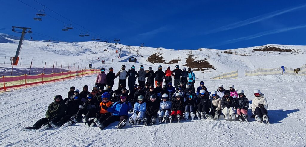 Am nächsten Morgen begann der erste richtige Skitag. Bereits um 8:30 Uhr ging es auf die Piste. Dort wurden wir zunächst in verschiedene Gruppen eingeteilt: Anfänger, Fortgeschrittene und Profis. Die Skischule wurde anfangs von drei Lehrkräften geleitet. Bis zum Mittagessen übten wir auf der Piste, sammelten erste Erfahrungen oder verbesserten unsere Technik. Das Mittagessen fand jeden Tag zwischen 11:15 Uhr und 12:30 Uhr statt. Danach wurden die Gruppen je nach Fortschritt neu eingeteilt.