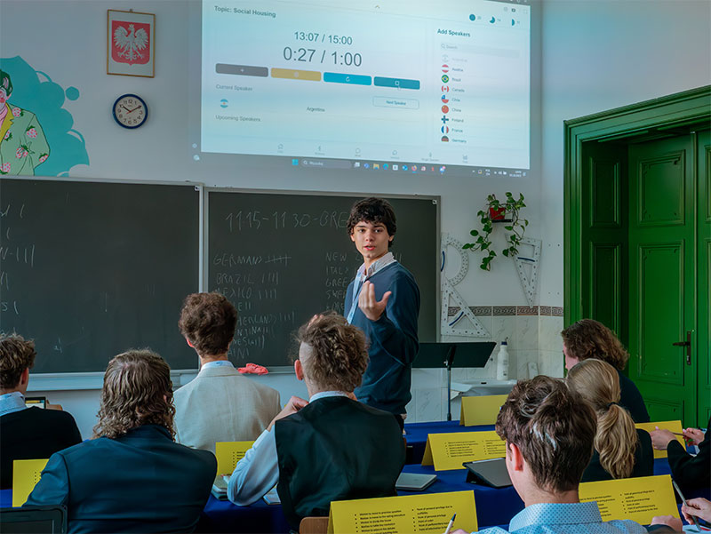 Es konnte also losgehen. Wir gingen zurück in die Schule, wo sich die Tagungsräume der Komitees befanden, in denen wir nun die nächsten drei Tage verschiedenste aktuelle weltpolitische Themen besprachen, etwa Bildschirmabhängigkeit und antimikrobielle Resistenzen in der World Health Organization (WHO), die Wohnraumkrise und ein mögliches Grundeinkommen für jeden Menschen der Erde im Economic and Social Council sowie die Reform von Friedensmissionen und die Lage im Südsudan im Security Council – um nur die Komitees zu nennen, in denen wir arbeiteten. Die Diskussionen wurden selbstverständlich auf Englisch geführt.